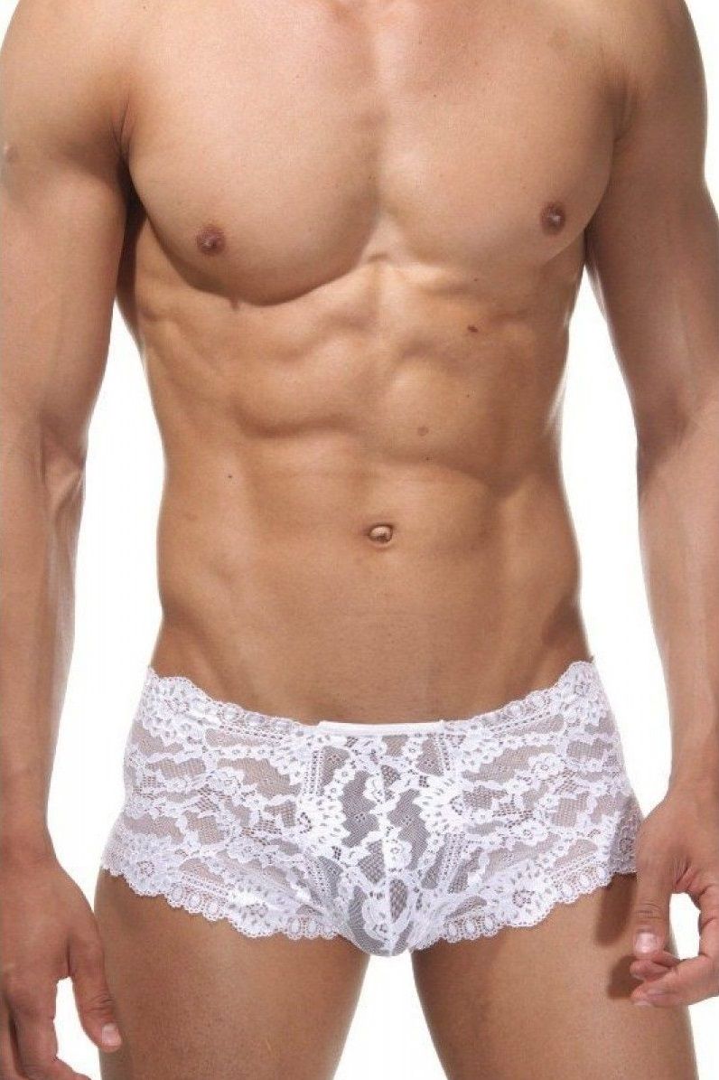 Мужское кружевное белье из мягкой и эластичной ткани белого цвета. Трусы плотно прилегают к телу, но при этом не доставляют никакого дискомфорта. Прекрасно украсят и дополнят любой образ и так же отлично смотрятся в одиночку.