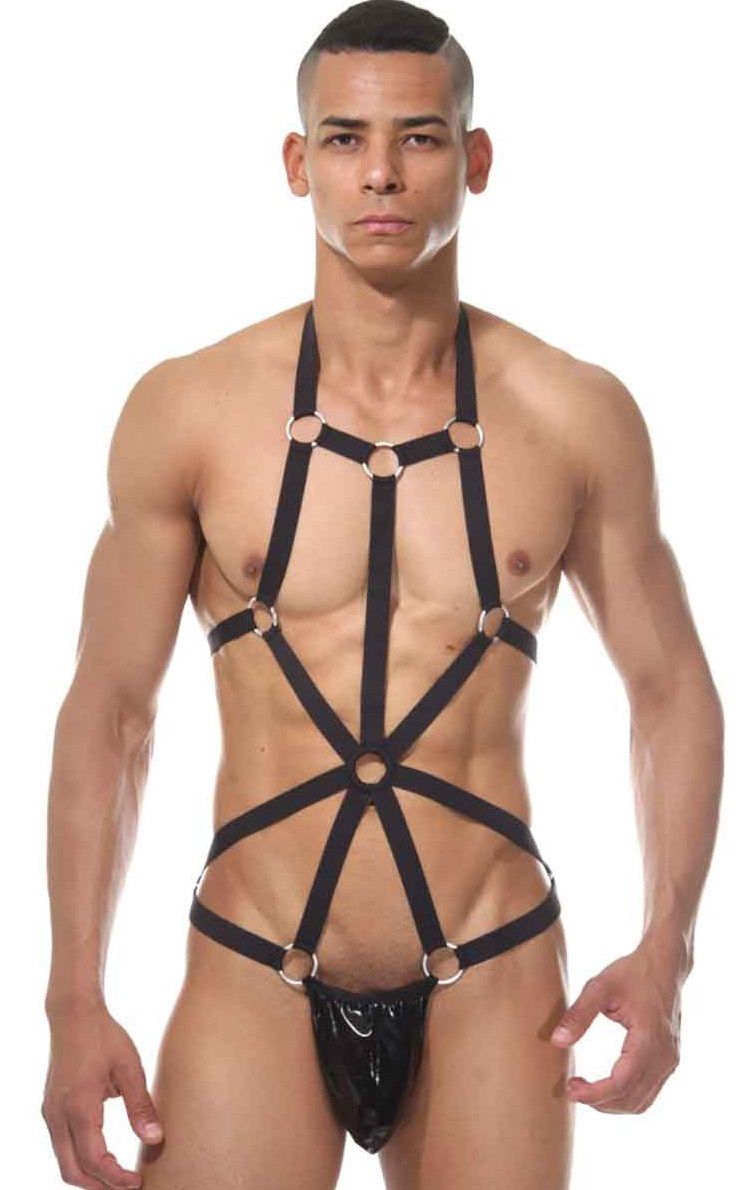 Мужское боди, сделанное из разной длины ремешков, соединенных между собой металлическими кольцами. Ягодицы в этом комплекте полностью открыты.
