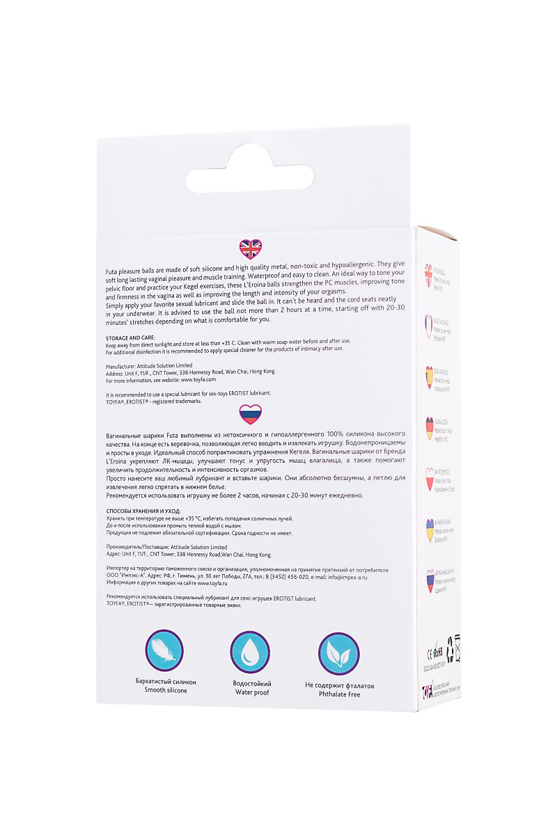Вагинальные шарики Futa выполнены из нетоксичного и гипоаллергенного 100% силикона высокого качества. На конце есть веревочка, позволяющая легко вводить и извлекать игрушку. Водонепроницаемы и просты в уходе. Идеальный способ попрактиковать упражнения Кегеля. Вагинальные шарики от бренда L’Eroina укрепляют ЛК-мышцы, улучшает тонус и упругость мышц влагалища, а также помогают увеличить продолжительность и интенсивность оргазмов. Просто нанесите ваш любимый лубрикант и вставьте шарики. Они абсолютно бесшумны, а петлю для извлечения легко спрятать в нижнем белье. Рекомендуется использовать игрушку не более 2 часов, начиная с 20-30 минут ежедневно. Рабочая длина - 6 см.